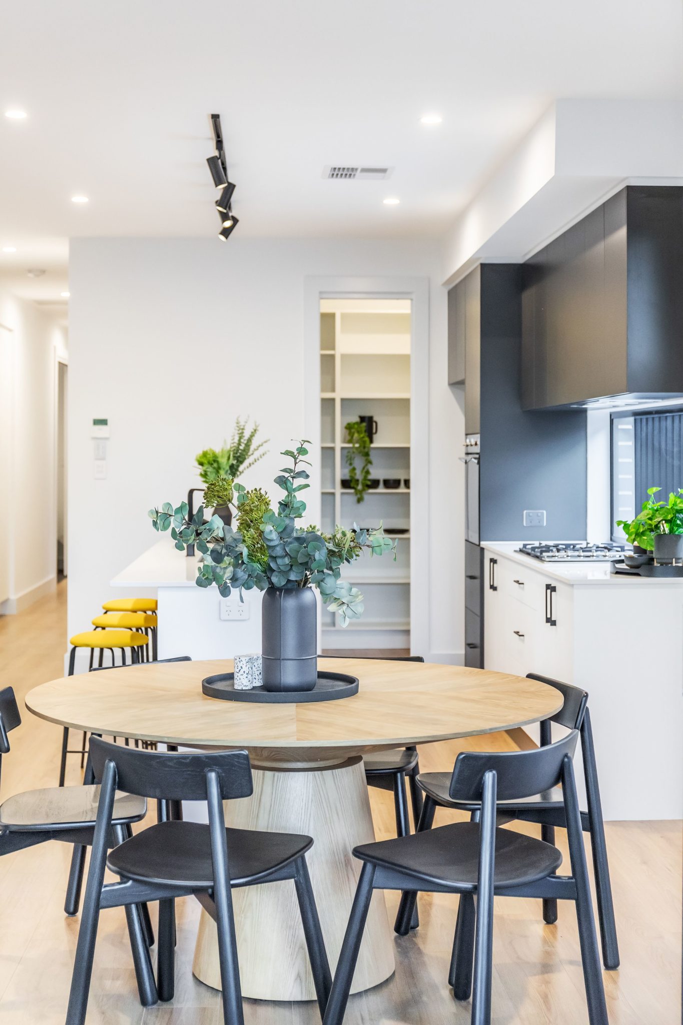 At the rear, an open plan living and dining room is overlooked by the gourmet kitchen. It’s fitted out with 900mm SMEG appliances, stone bench tops and sleek breakfast bar, plus a butler’s pantry to tuck away any clutter.